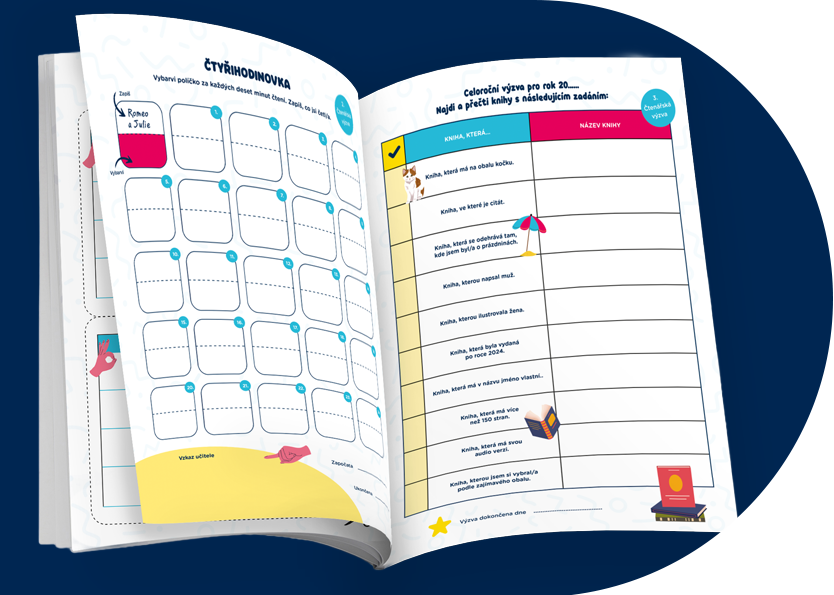 Zápisník čtenáře je stylový a přehledný deník formátu A4, který provází žáky na jejich čtenářské cestě. Slouží jako kreativní zápisník, do kterého si mohou zapisovat své postřehy a emoce. Součástí zápisníku jsou také čtenářské výzvy a prostor pro zápis až 20 knih formou originálních aktivit a zadání.
